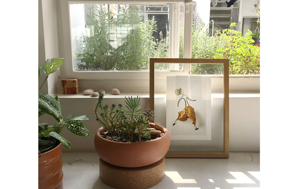 Recolhi uma coleção de folhas que secaram sem prensa, e com isso conservaram volume. A partir dessas formas criei mulheres, soltas ao vento, em uma colagem com folhas e aquarela.